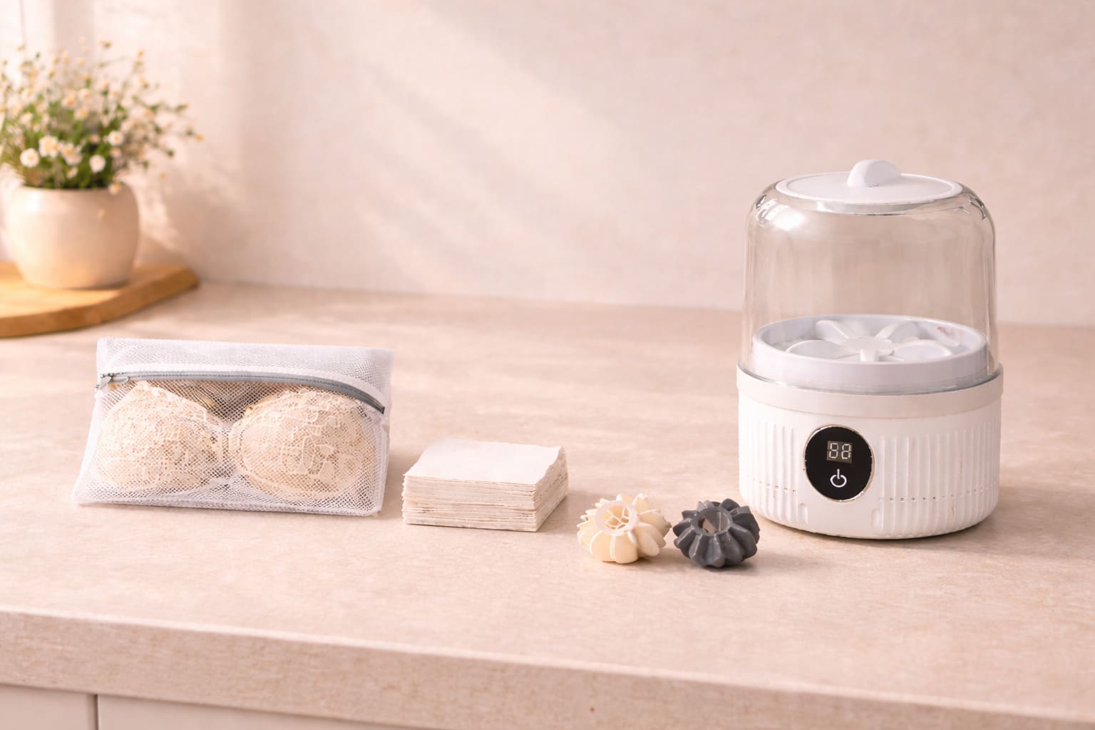 From left: Mesh Bag, Laundry Sheets, Agitation Balls and Mini Washer
