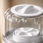 Controlled circular agitation in a compact chamber. Two wash modes, USB rechargeable, transparent glass so you can see the cycle working.